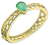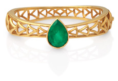 Dây chuyền, vòng đeo tay và nhẫn làm bằng vàng 22k cẩn lục bảo ngọc. Kiểu đơn sơ nhưng thanh nhã và những đường bóng láng phản ảnh nét cắt rõ ràng, tính chất thẳng thắn của con người đương thời.