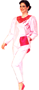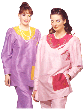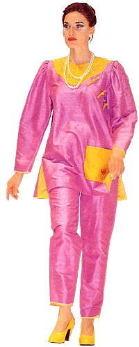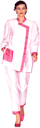 這件中國風味的服飾主要特色在於美麗的對比色調,滿清色系的補綴口袋以及外套前方與褲口的裝飾是絕佳的重點,質料是印度絲,有黃金、銀灰及粉紅色三式。