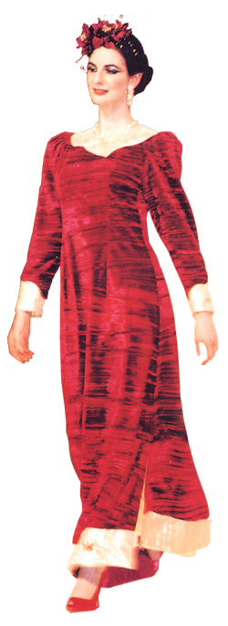 and crimson. The neckline, sleeve cuffs and hem are trimmed