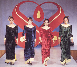質料採用竹子壓花絲絨,色彩有藍、黑、綠、暗紅,在領口、袖口、下擺配上不同的金蔥布並罩上一層古典緹花紗,有立體效果,裙擺採斜線剪裁。