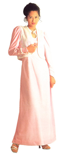 柔和的鵝黃、粉紅與水藍數款,胸前挖一圓孔,迷人又富創意,外罩齊腰短背心,背心有二組:鑲上亮片適合晚宴、華麗耀眼;平常時穿著的背心則不鑲亮片,高貴大方。
