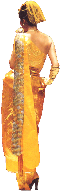 取自古代泰國服,金碧輝煌,單肩與截腰的設計顯得明快活潑,利用多種不同質料與質感的金黃布採多層疊法及自然垂褶,立體感十足,有活力的感覺。雖然採層次設計卻配合得當,不互相衝突。剪裁以圓弧為主,烘托女性的溫婉,手臂上配件平衡整體設計。頭飾古典又俏麗的造型予人高貴快樂的感覺!喚起昔日快樂的黃金時代,每位女性都是快樂的公主。