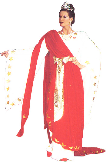 This velvet outfit is embellished with moon and star appliques, as if to call us back to our heavenly home, and to remind us not to forget our status as heavenly beings. Loose sleeves and curved floor length cape look classical and elegant.