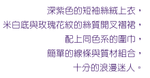 a pleated silk skirt with lavender patterns.