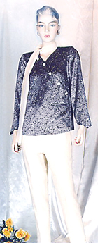 speckled brown silk blouse with a V-shaped neckline and beige