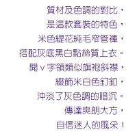 suit is characterized by contrasts in color and fabric quality.