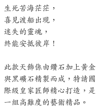 ◆「這整組作品叫做『到彼岸』,好像船載著人們到彼岸一樣,『到彼岸』就像完美的解脫法門,就像我們教人如何打坐,在此生中找到自己的平靜和解脫。它代表船載著人們通過狂風和巨浪,安全地到達海的彼岸,它會提醒你自己的偉大,提醒你解脫上天堂,啟發你修得自身的完美,直到成為自己的師父,然後你會忘記世間的煩惱,你會超越煩惱,就像船浮在海上一樣。」