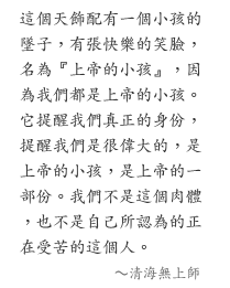 ◆「別忘了我們內邊的『小孩』,祂總是在那裡,任何時候我們叫衪,衪都會出來,衪會跳出來,那是上帝純真的天性,我們不會太擔心那麼多,我們不會計較做事要得回報;小孩不會這麼做,小孩從不擔心明天。」